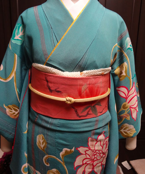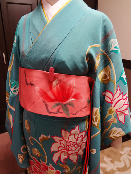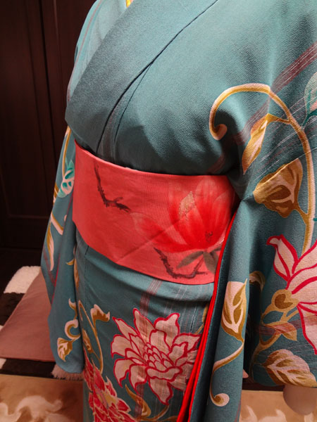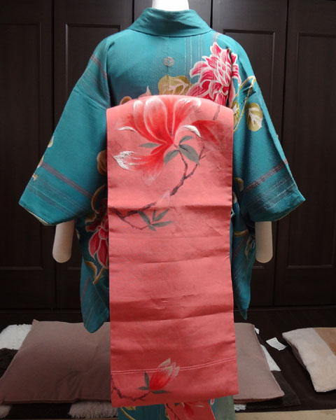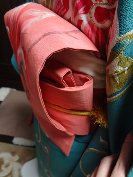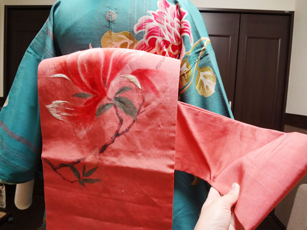 昔の帯に多いですが、二巻きするとたれが足りない短い帯や、普通に巻くとポイント柄がうまく出せない位置にある帯、があります。どちらも同じ巻き方で対処できますので、その流れを載せてみたく思います。参考にしていただけたら幸いです。(*^-^)