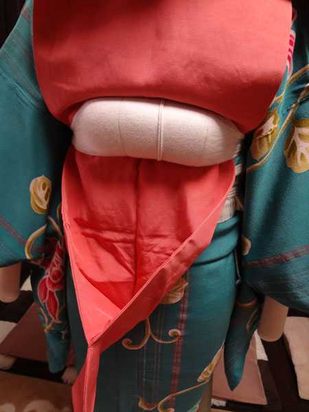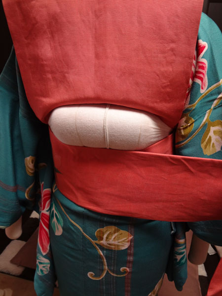 ※今回はポイント柄を出したいためたれが長めになっておりますが、全通で短い帯の場合はお太鼓が作れるだけのたれの長さにして枕をつけます。