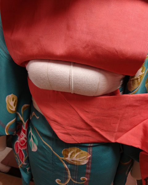 (枕が下がりやすいため、後ろ手で枕を上にあげ、帯も後ろが高くなるように意識して締めます)