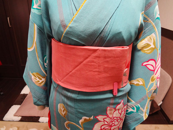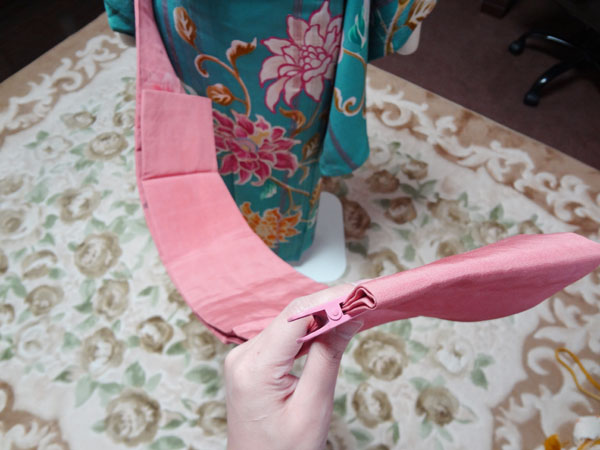 自装の場合は枕に帯揚げをかけておき、帯揚げは前でからげて放っておきます。