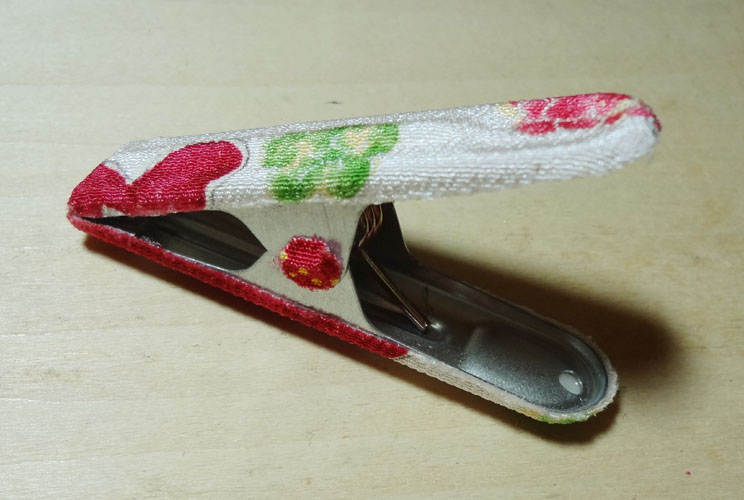そこで、洗濯ばさみで着物クリップを作ってみました。洗濯ばさみの主な欠点(一般的な樹脂製はピンチ力が弱いものが多い、ピンチ力が強すぎても着物や帯に跡がついてしまう、金具部分が着物や帯を引っ掛ける恐れがある、です)を補うべく、試行錯誤&改良をしながら作りました。